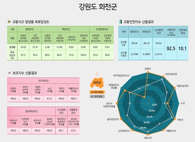 강원 화천군의 경우, 요인별 안전 수준은 발생요인(인구‧자동차수 대비 중사고건수) 98.3점, 희생요인(인구‧자동차수 대비 사망자수) 88.1점, 도로환경요인(도로연장거리 대비 중사고건수 및 사망자수) 94.9점으로 나타나 요인별 안전수준이 고르게 높은 점수를 보였다.