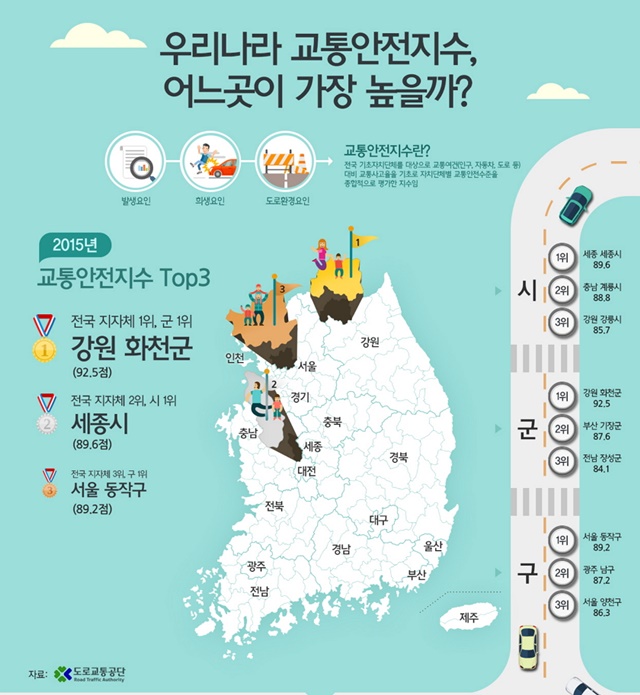 도로교통공단은 전국 기초자치단체별 교통안전수준을 나타내는 ‘2015년 교통안전지수’를 발표하고, 전국 227개 기초자치단체 중 교통안전지수 1위 지자체로 강원도 화천군이 선정됐다고 24일 밝혔다.