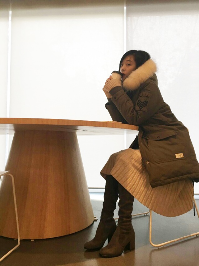 마지막으로 설리는 카키, 베이지, 브라운 등 겨울의 대표적인 컬러들의 조합을 통해, 계절감과 안정감을 동시에 부여하는 스타일링을 선보였다. 후드 부분의 포근한 퍼 디테일이 따뜻하게 감싸주며, 패딩보다 긴 기장의 니트 원피스와 롱부츠를 함께 매치해 여성스러운 느낌을 부각시켰다. 감각적이며 세련된 분위기를 자아내는 겨울 패션의 정석으로, 롱패딩 스타일링에 있어 어려움을 느끼는 이들에게 도움이 될 수 있는 좋은 예라 할 수 있다.