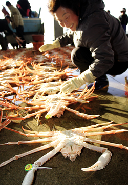 후포수협 판매과 박필성 씨는 “최근 대게 생산량이 급격히 는 데는 어민들의 자율관리가 큰 역할을 했다”며 “등껍질이 9cm 이하인 어린 개체와 암컷은 잡는 즉시 방류하는 등 어족 자원보호에 어민들이 스스로 나서고 있다”고 밝혔다. 울진군의 이런 노력 덕분에 자유관리어업 우수공동체로 선정돼 국무총리상을 받기도 했다. 지역축제로 승화시키기 위한 노력도 더해졌다. 해마다 4월이면 열리는 영덕과 울진 대게축제는 올해 8년째로 축제기간에 수십만 명의 관광객이 이 지역에 몰려 성황을 이뤘다. 대게축제는 대게잡이 체험행사, 대게 경매 참가, 무료 시식행사 등 다양한 프로그램으로 관광객에게 큰 인기를 끌었다. 천혜의 자연환경에서 나는 동해대게. 지자체의 브랜드화 노력과 어민들의 자발적인 어족 자원보호, 품질인증제를 통한 명품화 등으로 지역 특산품의 경쟁력을 높이기 위한 모범이 되고 있다. 지역이 특산품을 살리고 특산품이 지역을 살리는 선순환이 오늘도 울진과 영덕에서 계속되고 있다. |