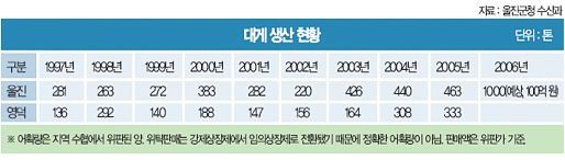 | 다리가 대나무처럼 생겨 붙은 이름, 대게. 경북 울진과 영덕의 대게산업은 도로의 발달과 함께 지역성장의 활력소가 되고 있다. 예로부터 임금에게 진상했다는 이 지역의 울진대게는 자체 브랜드화에 성공하기도 했다. 특히 거대한 수중 암초 왕돌초라는 천혜의 자연환경을 가진 울진 지역은 어족자원을 보호하려는 어민들의 자발적인 노력이 더해져 시너지 효과를 낳고 있다.