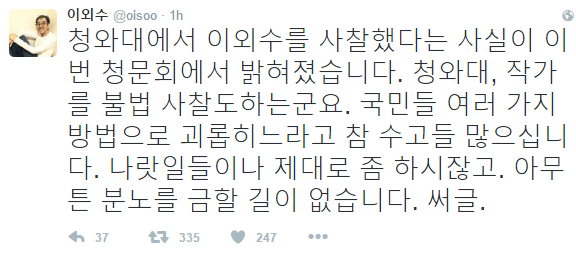 이외수 작가는 15일 자신의 트위터에 “청와대에서 이외수를 사찰했다는 사실이 이번 청문회에서 밝혀졌다”고 말했다.