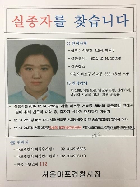 마포경찰서에 따르면, 이수현씨는 지난 14일 오후 10시53분께 홍대 인근의 한 클럽 앞에서 술에 취한 채 학교 동기와 대화하던 중 갑자기 화를 내고 사라졌다. 그 뒤 경찰은 이수현씨를 찾기 위한 공개수사를 실시한 바 있다.