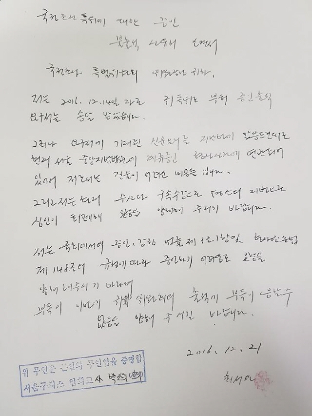 [시사뉴스피플=전은지 기자] 최순실씨가 이번에도 국조특위 청문회에 나오지 않을 것으로 보인다. 최순실 국정농단 국정조사 특별위윈회 의원인 하태경 새누리당 의원은 21일 자신의 페이스북에 최순실씨의 불출석 사유서를 게재했다.