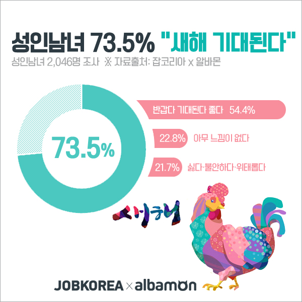 27일 알바몬이 공개한 성인남녀 2,046명을 대상으로 한 ‘2017년 새해가 기대되는지’ 설문 결과, ‘새해가 기대된다’는 응답자가 73.5%로 절대다수였다. ‘기대되지 않는다’는 응답자는 26.5%로 크게 적었다.
