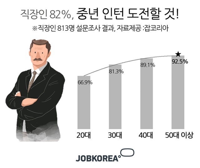 잡코리아가 최근 직장인 813명을 대상으로 ‘중년 인턴’에 관한 설문조사를 실시한 결과, 직장인 82.5%가 ‘퇴직 후 중년 인턴에 도전할 의향이 있다’고 답했다.