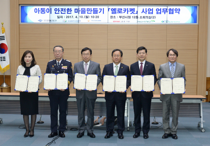 BNK부산은행과 부산광역시(시장 서병수), 부산광역시 교육청(교육감 김석준), 부산지방경찰청(경찰청장 허영범), 초록우산 어린이재단 부산지역본부(본부장 이수경), 도로교통공단 부산지부(지부장 이상민) 등 6개 기관은 4월 10일(월) 오전, 부산시청에서 ‘옐로카펫 조성 사업’ 업무협약을 체결했다.