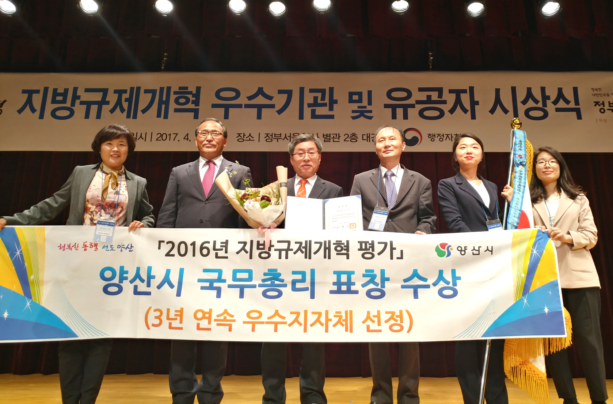 양산시가 지난 4월 28일 정부서울청사에서 열린 2016년 지방규제개혁 우수지자체 시상식에서 국무총리상을 받았다.