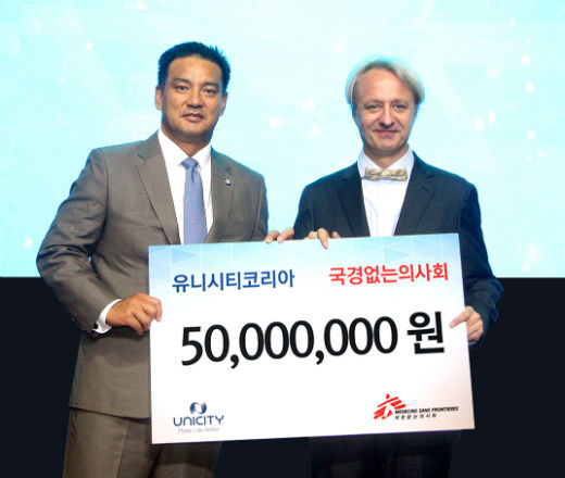 이날 국경없는의사회는 ‘2017 유니시티 코리아 컨벤션’ 행사에서 기금을 전달받았다. 티에리 코펜스 국경없는의사회 한국 사무총장이 바비 김 유니시티 인터내셔널 아시아태평양 총괄 부사장으로부터 직접 기부금을 전달받고 캠페인에 참여한 유니시티코리아 회원들에게 감사의 인사를 전했다.