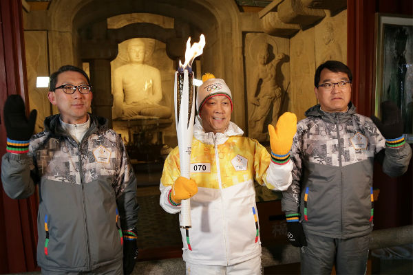 이후 성화봉송단은 신라 불교예술의 황금기에 조성된 인조 석굴인 석굴암을 찾아 본존불을 비롯해 10대 제자상, 십일면관음보살상 등 불상 38구를 성화의 불꽃으로 비췄다.
