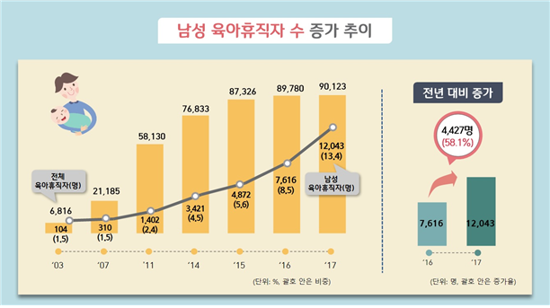 24일 고용노동부에 따르면, ‘17년 기준, 남성 육아휴직자는 12,043명으로 전년 대비 58.1% 증가하였고, 전체 육아휴직자(90,123명) 대비 남성 육아휴직자 비율은 13.4%를 차지하여, ’16년 8.5%였던 것에 비교하면 4.8%p 증가했다.