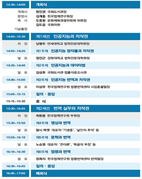 이번 세미나는 번역법률을 포함한 인공지능 창작물 관련 저작권법 쟁점에 관한 논의를 통해 미래 법률번역의 방향을 제시하고자 마련되었으며, 도종환 문화체육관광위원장, 김도읍 국회의원 등 주요 인사를 비롯해 법학 연구자 및 번역 전문가들이 참석할 예정이다.