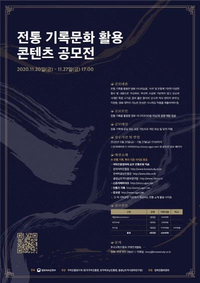 [시사뉴스피플=이수민 기자] 문화체육관광부가 한국국학진흥, 한국학호남진흥원, 충청남도역사문화연구원과 함께 11월 20일(금)부터 27일(금)까지 ‘전통 기록문화 활용 콘텐츠 공모전’을 개최한다고 16일 밝혔다. 처음으로 개최되는 이번 공모전은 2015년부터 대학(원)생을 대상으로 진행해 온 ‘스토리테마파크 창작 콘텐츠 공모전’에 이어, ‘우리 국민 누구나’ 참가할 수 있는 행사로 새롭게 만들었다.
