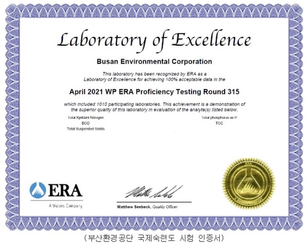 [시사뉴스피플=노동진 기자] 부산환경공단(이사장 배광효)이 10일 미국환경자원협회(ERA, Environmental Resource Associates)가 주관하는 ‘국제숙련도 시험’ 수질분야에서 우수기관으로 선정됐다고 밝혔다.