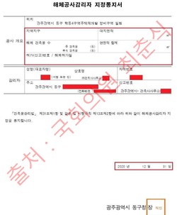 국회 국민의힘 최춘식 의원(경기 포천시・가평군, 행정안전위원회)이 광주시의 자료를 조사한 결과, 동구청은 지난해 12월 31일 붕괴건물에 대한 철거공사감리자(건축사사무소 ○○, 광주시 동구 소재)를 지정하면서 ‘대지면적, 철거 건물 수, 연면적, 허가번호, 허가일’ 등의 내용이 누락된 ‘감리자 지정통지서’를 조합 측에 발급한 것으로 나타났다.