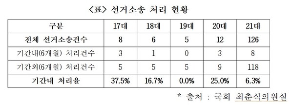 국회 국민의힘 최춘식 의원(경기 포천시・가평군, 행정안전위원회)이 중앙선거관리위원회의 자료를 조사한 결과, 8월 17일 기준 2004년(제17대 국회의원선거) 이후 국회의원선거에 관한 소송의 법정처리기간(소 제기된 날부터 6개월 이내) 내 처리율은 17대 37.5%, 18대 16.7%, 19대 0%, 20대 25%, 21대 6.3%인 것으로 확인됐다.
