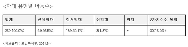 학대 유형을 보면 전체 230명 중 정서학대가 136명으로 가장 많았고, 신체학대가 61명, 그리고 성학대가 3건이나 발생한 것으로 나타났다.