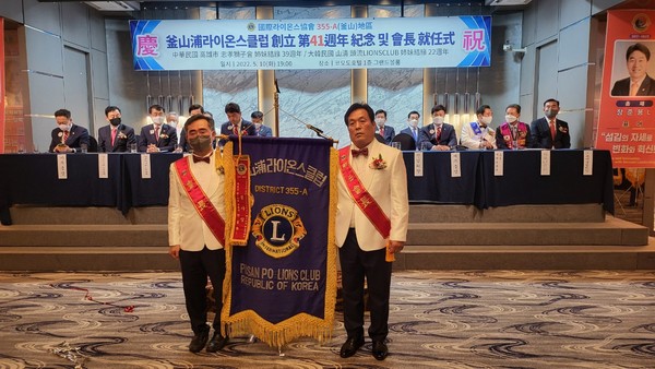 [시사뉴스피플=노동진 기자] 국제라이온스협회 355-A(부산)지구 부산포라이온스클럽이 지난 5월 10일 코모도호텔에서 41주년 기념식 및 회장 이취임식을 개최했다. 부산포라이온스클럽은 1980년 등대라이온스클럽을 스폰서로 창립, 현재 회원 수 60명이다. 이날 신임회장으로 취임한 신세계매매상사 이광용 대표는 “회원들이 자발적으로 참여할 수 있는 클럽으로 만들겠다”고 포부를 밝혔다.