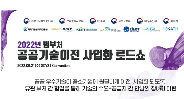 [시사뉴스피플=박일봉대기자] 과학기술정보통신부와 산업통상자원부, 환경부, 국토교통부, 해양수산부, 그리고 특허청은 오는 21일 우수 공공기술의 민간 이전·사업화 촉진을 위한 『2022년 범부처 공공기술 이전·사업화 로드쇼』를 잠실 롯데타워에서 개최한다.