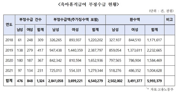국회 환경노동위원회 소속 국민의힘 이주환 의원(부산 연제구)이 고용노동부에서 제출받은 ‘육아휴직급여 부정수급 현황'에 따르면 최근 4년간(2018년-2021년) 육아휴직급여 부정수급은 총 1,324건, 금액은 65억4천만원에 달했다.