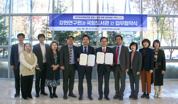 [시사뉴스피플=노동진 기자] 국회도서관(관장 이명우)이 26일 오전 11시 강원연구원 1층 RIG 갤러리에서 강원연구원(원장 현진권)과 국가지식정보의 공동 활용을 통해 입법 및 지역 연구를 위한 정책개발 역량 강화에 관한 업무협약을 체결했다.