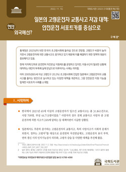 [시사뉴스피플=노동진 기자] 국회도서관(관장 이명우)이 10일 ‘일본의 고령운전자 교통사고 저감 대책: 안전운전 서포트카를 중심으로’를 다룬 ‘현안, 외국에선?’(2022-21호, 통권 제47호)을 발간했다.
