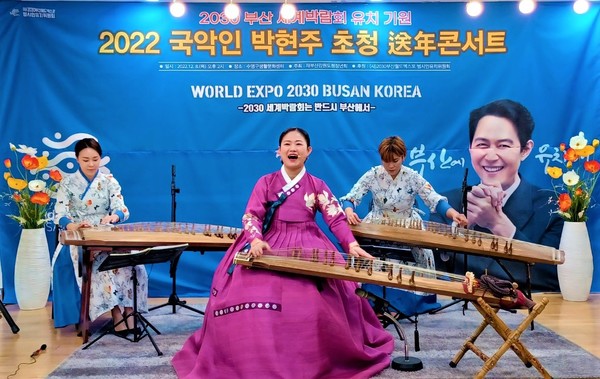이날 부산 출신의 국가무형문화재 가야금산조 및 병창 이수자 박현주 씨는 한복을 곱게 차려입고 가야금을 연주하며 깊은 농현과 화려한 우리 가락에 세계박람회 유치의 간절함을 실어 열창했다.