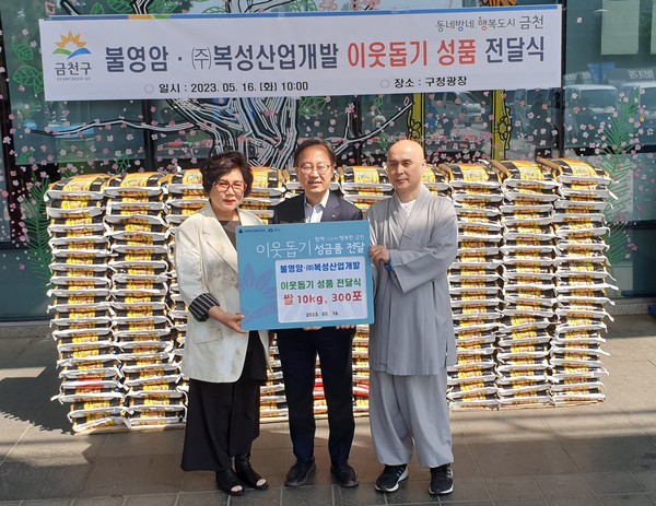 [시사뉴스피플=노동진 기자] ㈜복성산업개발(회장 박금태)이 지난 16일 오전 서울시 금천구청(구청장 유성훈)을 방문해 ‘사랑의 백미 나눔 전달식’을 진행했다.