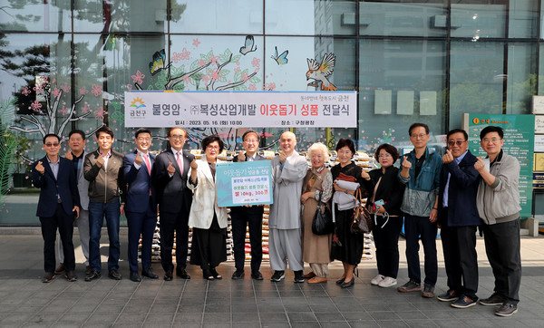 이날 유성훈 구청장은 금천구청 청사 9층에 위치한 청장실로 ㈜복성산업개발 박금태 회장과 임원들, 불영암 덕유 주지스님을 초청해 간단한 담소도 나눴다. 이후 1층 광장으로 이동해 관내 취약계층을 위한 백미10kg 300포를 전달하고 기념촬영을 진행했다.