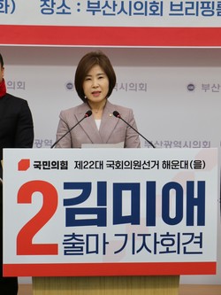 [시사뉴스피플=박용준 기자] 국민의힘 김미애 의원(부산해운대을)이 20일 오후 2시, 부산시의회 브리핑룸에서 ‘새로운 해운대’를 만들겠다는 청사진을 밝히며 제22대 총선 출마를 공식 선언했다.