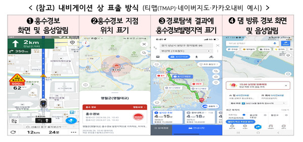 7월부터 순차적으로 카카오내비·티맵(TMAP)·네이버지도·현대차·기아 내비게이션·아틀란·아이나비에어 등 국민들이 주로 이용하는 6개 주요 길안내기(내비게이션)를 통해 전국 223개 지점의 홍수경보를 실시간으로 확인 가능하다.
