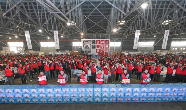 [시사뉴스피플=노동진 기자] BNK금융그룹(회장 빈대인)은 부산시 북항 제1부두 물류창고에서 그룹 경영진을 포함한 전 계열사 임직원이 함께한 가운데 새해 첫 번째 ‘BNK 사회공헌의 날’ 행사를 개최했다고 18일 밝혔다.