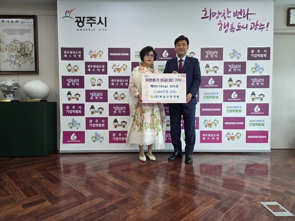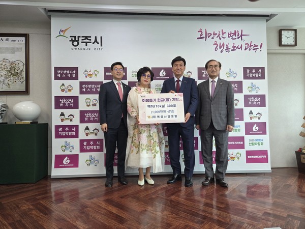 [시사뉴스피플=노동진 기자] ㈜복성산업개발 박금태 회장은 28일 경기도 광주시청을 방문 ‘사랑의 백미 300포’(10kg·1천만원 상당)를 기부했다.