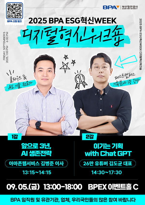 [시사뉴스피플=노동진 기자] 부산항만공사(BPA, 사장 송상근)는 오는 9월 5일 13시, 부산항국제전시컨벤션센터(BPEX) 5층 이벤트홀에서 공개형 디지털 워크숍을 개최한다고 밝혔다.