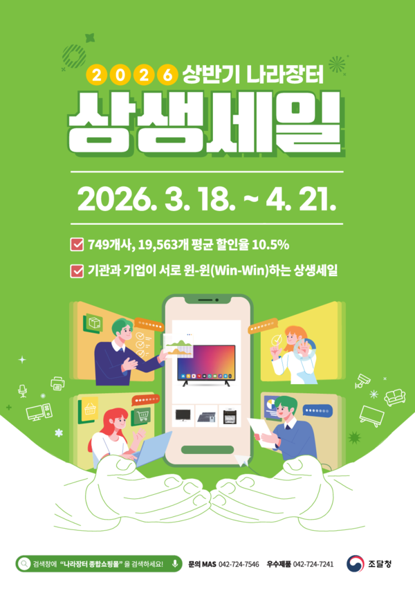 [시사뉴스피플=노동진 기자] 조달청은 조달기업의 판로를 지원하고 공공기관의 예산 절감을 돕기 위해 오는 3월 18일부터 4월 21일까지 5주간 ‘2026년 상반기 나라장터 상생세일’을 개최한다.