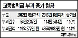 218조 5,000억원으로 올해 정부 국세수입 전망액(202조 4,000억원)보다 8% 가량 많았다. 이 의원은 세법개정 효과, 최근 국세 증가율, 국세탄성치 등을 종합적으로 분석한 결과 내년도 국세수입 전망액이 5조원 가량 과대 계상돼 있다고 지적했다. 우선 취득세 인하에 따른 지방재정 보전 대책으로 지방소비세율이 5%에서 8%로 인상되면 내년도 국세가 2조원 가량 줄어들고, 늘어날 수 있는 금액은 올해 세제개편에 따른 4,300억원 정도라는 분석이다. 또한 이명박 정부 5년간 연평균 국세수입증가율이 4.8%인 것을 감안하면 국세수입 증가율을 8%로 계상한 것은 과대 계상됐을 뿐 아니라, 경제성장률과 국세탄성치도 지나치게 높은 수준이라고 지적됐다. 이용섭 의원은 “올해 세수부족도 정부가 하향조정된 성장률 전망을 반영하지 않았기 때문”이라며 “정부가 내놓은 내년 경상성장률 6.5%는 과대 계상돼 있고, 국세탄성치 1.2도 이명박 정부 5년간 평균 탄성치가 0.9인 것을 감안하면 높다”고 말했다. 더불어 박근혜 정부가 부족한 세수를 메우기 위해 비교적 징수가 쉬운 교통 및 경범죄 단속을 강화하고 있다는 지적이 나온 바 있다. 지난 15일 민주당 박남춘 의원실이 경찰청으로부터 제출받은 자료에 따르면, 교통경찰관이 올 6월까지 현장 단속을 통해 범칙금을 부과한 건수가 114만 2,414건으로 지난해 같은 기간 54만 2,087건 대비 110% 증가한 것으로 집계됐다. 범칙금 부과금도 199억원에서 425억원으로 전년대비 114% 증가했다. 경범죄처벌법 위반으로 경찰이 현장에서 범칙금을 부과한 건수도 큰 폭으로 늘었다. 올 6월 기준 범칙금 부과건수(통고처분, 즉결심판)와 부과금액은 3만 7,618건과 8억 1,938만원으로 지난해 같은 기간 2만 5,355건, 4억 3,394만원 대비 48%, 88% 증가한 것으로 나타났다. 경찰은 교통사고량 증가와 올 초 개정된 경범죄처벌법 시행에 따라 단속이 증가했다고 설명했다. 그러나 세수부족에 시달리는 정부가 교통단속 등을 강화해 부족한 세수를 메우려한 것 아니냐고 박 의원은 지적했다. 박남춘 의원은 “정부가 선거 때는 봐주기로 일관하다가 선거 때만 지나면 법질서 확립 운운하며 단속을 강화한다”며 “과잉단속으로 공권력 남용이나 서민 피해가 우려되는 만큼 국민들이 납득할 수준의 단속과 조치가 이루어져야 한다”고 피력했다. 부족한 세수를 메우기 위해 어려운 국민들의 허리끈을 더 졸라매게 할 것이 아니라 합리적인 정책으로 진정한 국민행복시대가 열리길 바라는 바이다. <NP>