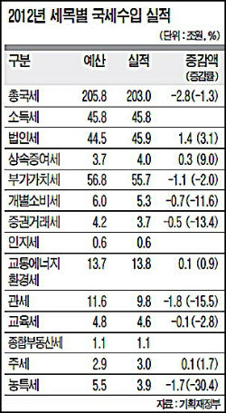 지난 2005년 이후 줄곧 예산을 초과 달성했던 국세수입 실적이 8년 만에 예산에 크게 미달한 것으로 나타나면서 올해 세수 확보에 초비상이 걸렸다. 지난해 정부의 빗나간 경제성장 예측이 세입예산 과다로 이어졌다. 결국 경기침체 지속으로 성장률이 하락해 세수입이 예산에 못 미치는 상황이 벌어진 것이다. 이에 따라 지난해 세수입을 전제로 짜였던 일부 사업계획의 연기가 불가피해졌다. 이는 올해 내년 사업계획 수립에도 악영향을 미칠 것으로 전망된다. 올해 세수관리도 문제다. 지난 10월 8일 기획재정부에 따르면 올해 국세수입 실적을 보면 소득세, 법인세 등 주요 세목의 수입은 대부분 양호한 수준이나 민간소비, 수입 둔화 등으로 인해 부가세와 관세 등이 크게 줄었다. 기재부는 경기침체와 수입액 감소로 인해 부가세의 경우 1조 1,000억원, 관세는 1조 8,000억원이 각각 줄어든 것으로 분석했다. 근로소득세의 경우 취업자수 증가와 명목임금 상승에 따라 전년 대비 1조 2,000억원이 늘었다. 그러나 원천징수세액 인하조치로 인해 약 1조원이 감소하면서 예산 대비 7,000억원의 부족분이 생겼다. 법인세는 법인 신고소득 증가 등에 힘입어 예산 대비 1조 원이 증가했다. 더불어 2013년 세법개정안의 근본적인 목표 중 하나는 박근혜 정부의 국정과제 추진에 필요한 재원 마련이었다. 정부는 ‘국정과제 이행을 위한 재정지원 실천계획’(공약가계부)에서 향후 5년간 48조원가량을 추가로 마련하겠다고 밝혔다. 특히 내년에는 7조 6,000억원의 추가 세입예산을 확보하겠다고 했다. 그러나 이 같은 기준에서 본다면 세법개정안은 실패작이다. 이번 세법 개정으로 마련할 수 있는 세금은 5년간 2조 4,900억원에 그치기 때문이다. 이 중 소득공제를 세액공제로 전환해 추가 발굴한 세원이 1조 3,000억원이다. 당장 내년 재정이 문제다. 내년에 추가로 얻는 세수가 4,300억원에 불과하며, 필요보다 7조원이상 모자란다. 정부가 8일 “비과세ㆍ감면정비, 지하경제 양성화 등 과세기반 확대를 우선적으로 추진한 뒤 그래도 추가 재원이 필요하다면 사회적 공론화 과정을 거쳐서 세입 확충의 폭과 방법에 대한 합의를 도출하겠다”고 밝힌 것은 이번 세법개정안의 한계를 인식하고 있다는말이다. 정부는 이날 ‘중장기 조세정책방향’을 통해 “2007년 21%까지 증가했던 조세부담률이 감세정책 등으로 인해 하락했다”며 “조세부담률을 2017년까지 21%로 되돌려놓겠다”고 밝혀 증세 가능성을 열어뒀다. 하지만 증세 성격은 논란을 예고하고 있다. 소득세와 소비세는 올리고 법인세와 재산세는 낮추겠다는 뜻을 분명히 하고 있기 때문이다. 이날도 정부는 “조세구조가 경제협력개발기구(OECD) 평균에 비해 소득세, 일반소비세 비중이 낮고, 법인세, 재산세 비중이 높다”고 밝혔다.결국 국민들 부담만 가중?