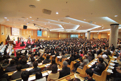 정주채 목사는 선교란 그 사람들을 구원해야 된다는 의미도 있지만 그냥 순수하게 그 사람들의 고달프고 힘든 삶을 이해해서 용기와 희망을 가지고 세상을 살아갈 수 있도록 도와주는 모든 행위라고 했다. 그 진리 를 실천하기 위해 교회는 해외 선교사들 90명 정도와 국내 어려운 농어촌 교회나, 미자립교회 등 70여 곳, 장애자나 빈민, 엔지오 단체들 40여 군데 지원을 해주고 있다고 한다. 그리고 우리 교회 안에서는 경로대학을 통해서 어른들을 섬기고, 형편이 어렵거나 결손가정인 학생들이 공부하는 방과 후 교실과 악기에 관심이 있는 아이들을 모아 교회에서 훈련시키는 청소년 오케스트라와 합창단도 운영 중에 있다. 불량기 있던 아이들이 음악에 대한 애정과 희망으로 차츰 교화되는 모습을 보며 감사하고 있다. 지금은 수준도 월등해져서 성남 아트홀 음악회에 특별 출연도 하기도 했다. 지금의 교회가 비난의 창을 넘어 사회의 걱정거리가 되고 있는 점에 안타까움을 토로하던 정목사는 이렇게 까지 폐단이 생기게 된 이유가 양적 성장 때문이라는 점을 강조했다. 그러면서 교회직분은‘명예’가 아니고‘멍에’라는 표현을 썼다. 교회에서 목사나 장로 등의 어떤 직분을 갖게 되는 것은 섬기라는 뜻인데도 불구하고 대개 섬김 받는 자리를 탐하는 경우가 많은데, 섬기며, 일하라고, 명예를 주는 것이지 훈장을 준 게 아니라는, 그러니까 교회 직분은 명예가 아니고 멍에라는 가르침이었다. 11월 3일 은퇴 후에도 오로지 남을 섬길 수 있는 훌륭한 목회자들 양육하는 신학교육에 봉사하고 싶은 마음뿐이라는 정주채 목사의 행보를 기대해 본다. <NP>