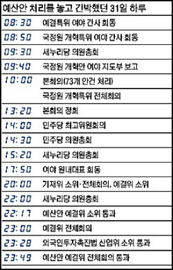 원이 12월 30일 오전 1시, 김명환 철도노조위원장을 찾아가 파업철회 합의문을 이끌어 낸 것이 2014년 예산안 처리의 계기가 됐다. 두 의원은 그 이후 같은 날 오전 9시 양당 회의에서 각각 추인을 받았고, 철도파업 철회 선언을 계기로 정치권에도 화해무드가 조성됐다. 또 ‘아베 신조 일본 총리의 야스쿠니 신사 참배 규탄 결의안’을 만장일치로 채택한 것 역시 여야간 협상 분위기에 힘을 보탰다. 이어 국회 기획재정위원회 산하 조세소위원회에서 소득세 최고세율(38%) 과세표준 구간을 현행 ‘3억원 초과’에서 ‘1억5000억원 초과’로 낮추기로 잠정 합의한 것도 여야 협상 분위기를 순화시키는 계기가 됐다. 그러나 쉽게 끝날 예산안이 아니었다. 95% 합의를 이뤄내며 타결 직전까지 갔던 ‘국정원 개혁안’에 급제동이 걸리면서 급격하게 분위기가 얼어붙었다. 국정원 정보관(IO)의 정부기관 상시출입 금지 법제화와 사이버심리전단 활동 처벌 규정 명문화 등을 놓고 여야가 충돌한 것이다. 이 문제를 놓고 새누리당 최경환 원내대표와 민주당 전병헌 원내대표는 지난 12월 30일 밤 10~11시 사이 수차례 합의를 반복하며 신경전을 벌였다. 여야는 이날 밤을 새우는 한이 있더라도 반드시 예산안과 법안을 처리하겠다는 각오로 당 소속 의원들에게 비상대기령을 내린 채 합의를 이어나갔다. 예결위는 이날 밤 10시쯤 소속 의원들에게 새벽 3시에 예결위 전체회의를 하겠다는 일정을 통보하기도 했다. 하지만 이견을 좁히지 못한 여야는 최종 합의에 이르지 못하고, 지도부는 결국 자정을 넘기고 의원들에게 귀가를 통보했다. 이에 의원들은 “또 속았다”, “혹시나 했는데 역시나”라는 푸념을 털어놓았다. 밤새 합의를 계속한 국정원 특위 여야 간사는 12월 31일 오전 8시에 사실상의 합의안을 도출했다. 국정원 개혁 특위는 오전 11시 전체회의를 열어 국정원 개혁안 관련 법안을 처리하면서 협상 분위기가 급물살을 타는 듯 했다. 그러나 새누리당이 사활을 걸고 나선 외국인투자촉진법(외축법) 개정안을 민주당 의원들이 강력하게 반대하면서 다시 제어가 걸렸다. 외촉법을 ‘재벌특혜법안’이라고 규정한 민주당 내 강경파 의원들의 반발로 민주당은 오후 3~7시까지 약 4시간 동안 마라톤 의원총회를 거치면서 예산안 처리 역시 무산되는 것 아니냐는 전망이 제기되기도 했다. 특히 국회 법제사법위원회 위원장인 민주당 박영선 의원은 “이 법만큼은 내 손으로 상정할 수 없다”고 반대의견을 굽히지 않았다. 4시간여의 민주당 의원총회에서 아무런 결론을 내리지 못하자 전병헌 원내대표가 나서 새누리당 최경환 원내대표와 추가 협상에 나섰다. 이 과정에서 새누리당은 연내에 예산안만 처리하고 국정원 개혁법안과 외촉법 처리를 오는 2월로 미루자는 제안을 하기도 했다. 외촉법과 상설특검제 도입을 연계시키는 중재안이 나오기도 했지만 모두 무산됐다. 결당내 논란이 확산되자 민주당 김한길 대표가 나서 “나에게 맡겨달라”고 의원들을 설득했고, 박수로 추인을 받으며 외촉법을 받아들이기로 했다. 김 대표는 외촉법 처리를 받아들이는 대신 국정원 개혁관련 법안을 먼저 처리하도록 하는 안을 새누리당에 제안한 것으로 전해졌다. 이에 밤 11시에 소관 상임위인 국회 산업통산자원위원회를 열어 외촉법을 통과시켰다. 윤상직 산업통상자원부 장관은 민주당 의원들에게 큰 절까지 한 것으로 알려졌다. 이어 여야 의원들은 일사분란하게 움직여 예결위를 열고 자정 직전 새해 예산안을 통과시켰다. 그러나 새해 예산안의 본회의 처리는 해를 넘기게 됐다. 2012년에 이어 2년 연속이자 헌정사상 두 번째로 해를 넘겨 예산안을 처리하는 불명예를 떠안게 됐다. 여야는 우여곡절 끝에 1월 1일 새벽 3시 50분 본회의를 개의했고, 오전 5시 15분에 예산안이 처리됐다. 우려했던 준예산 사태는 피하게 된 것이다. 올해부터는 여야가 해를 넘겨 예산안을 처리하는 모습은 역사 속으로 사라진다. 개정 국회법에 신설된 예산안 자동 상정제도 때문이다. 지난 5월 개정된 국회법은 매년 11월 30일까지 예산안 심사를 마치도록 했다. 이 기한을 넘기면 12월 1일 국회 본회의에 예산안이 자동으로 상정된다.