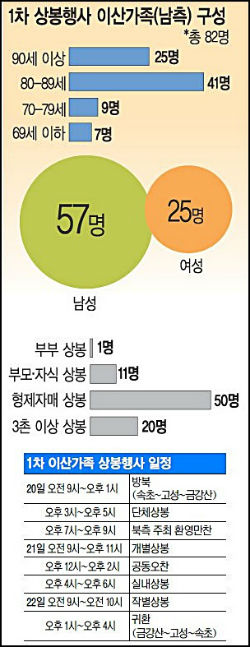 이산가족상봉을 하루 앞둔 지난 19일 상봉 가족들이 강원도 속초에 모여 60년 넘게 만나지 못했던 가족 재회의 길을 준비했다. 2월 18일 통일부에 따르면 올해 96세인 김성윤 할머니 등 남측 이산가족상봉 대상자 83명은 동반 가족 61명과 함께 19일 오후 2시까지 강원도 속초에 있는 한화콘도에 집결한다고 전했다. 이번에 상봉하는 이산가족은 90대 27명, 80대 42명, 70대 9명, 60대 이상 5명으로 이들은 신원 확인과 건강검진 절차를 거친 뒤 행사를 주관하는 대한적십자의 방북 교육을 받고 상봉의 설렘 속에 하룻밤을 보냈다. 이산가족들은 이튿날인 2월 20일 오전 9시 류길재 통일부 장관의 배웅을 받으며 속초에서 출발해 강원도 고성의 동해선 남북출입사무소(CIQ)에서 현대아산이 운영하는 버스로 갈아타고 오후 1시에 상봉 행사장인 금강산호텔에 도착했다. 만일의 경우에 대비해 남측 의료진 12명과 구급차 1대도 이들과 동행했다. 이산가족들은 오후 3시 금강산호텔에서 열리는 ‘단체상봉’을 비롯해 2월 22일까지 4차례 상봉과 공동중식 등을 가지며 11시간 동안의 만남을 가졌다. 이들과 만나는 북한 가족들은 모두 180명이다. 최근 기록적인 폭설이 내린 강원도 일대에는 19∼20일에도 눈이 내려 고령 이산가족들의 상봉길에 어려움을 가중시킬 것이라는 염려가 나오기도 했다. 정부 당국자는 “금강산 현지에서 제설차량 15대를 동원해 눈을 치우고 있다”며 “눈 때문에 이산가족들이 탄 차량의 이동 속도가 다소 느려질 수는 있겠지만 상봉 행사에는 지장이 없을 것”이라고 말했다. 한편 북측 상봉 대상자들이 남한의 가족들을 만나는 2차 상봉 행사는 23일부터 25일까지 진행됐다. 이 행사에 참석할 북측 상봉 대상자들은 88명이며 남한 가족들은 372명이다.눈물바다를 이룬…