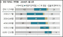 지난 3월 21일 새정치민주연합 지지율이 하락세로 돌아서며 30%선 아래로 내려간 것으로 확인됐다. 한국갤럽이 3월 17~20일 전국 만 19세 이상 남녀 1,216명을 대상으로 ‘민주당과 안철수의 새정치연합이 함께 새정치민주연합을 만들기로 했다. 귀하는 새누리당, 새정치민주연합, 통합진보당, 정의당 등의 정당 중에 어느 정당을 지지하냐’고 물은 결과 새누리당 42%, 새정치민주연합 28%, 통합진보당 2%, 정의당 1%, 기타 정당 1%, 없음ㆍ의견유보 26%로 나타났다. 새누리당은 전주 41%에서 42%로 1% 상승한 반면 신당 창당과 합당을 동시 추진 중인 새정치민주연합은 30%에서 28%로 2% 하락했다. 한국갤럽은 “연령별로는 50~60세대의 절반 이상이 새누리당을 지지했고 20~30세대는 새누리당보다는 새정치민주연합에 힘을 실었다”며“40대는 새누리당 35%, 새정치민주연합 33%로 비슷하게 갈렸다”고 분석했다. 또 “저연령일수록 의견 유보가 많으며 특히 20대는 그 비율이 35%에 달했다”며 “이념성향별, 지역별 정당 지지 구도는 지난주와 유사했다”고 설명했다. 한국갤럽은 또“이번 주 새정치민주연합의 지지도 하락은 주초 정강정책 조율 중 안철수 측의 6ㆍ15, 10ㆍ4 남북 선언 삭제 주장으로 불거진 역사 인식 논란, 기초연금법과 기초선거 무공천 등을 둘러싼 갈등에서 비롯한 것으로 볼 수 있다”고 분석했다. 그러면서“야권 지지자들은 새정치민주연합이 하루빨리 일사불란한 조직력을 갖춰 여당에 맞서주길 바라지만 현재 새정치민주연합은 한지붕 두 가족처럼 어수선한 모습”이라고 지적했다. 이번 조사의 표본오차는 95% 신뢰수준에서 ±2.8%였다. 응답률 15%였다. 총 통화 8,211명 중 1,216명이 응답을 완료했다. 조사 방식은 한국갤럽 자체조사였다. 표본추출 방식은 휴대전화 RDD 표본 프레임에서 무작위 추출 방식이었다. 응답방식은 전화조사원 인터뷰 방식이었다.
