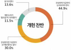 이와 함께 ‘개헌 논의 찬반과 시점’을 묻는 질문에는 44.9%가 ‘개헌에 찬성하며 지금부터 논의돼야 한다’, 30.0%가 ‘개헌에 찬성하지만 지금부터 논의할 필요는 없다’, 11.5%가 ‘개헌 논의가 필요 없거나 반대 한다’고 응답했다. ‘잘 모름’은 13.6%였다.