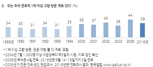 추석 때 1박 이상 귀향 계획 응답은 1990년대 초반 31~35%에서 2000년 이후로는 40% 내외로 높아진 것으로 나타났다. 이에 대해 갤럽 관계자는 “인구의 도시 집중과 핵가족화 등의 영향으로 고향 방문이 높아졌다”며 “교통편이 발전한 것도 한 몫한 것으로 보인다”고 전했다.