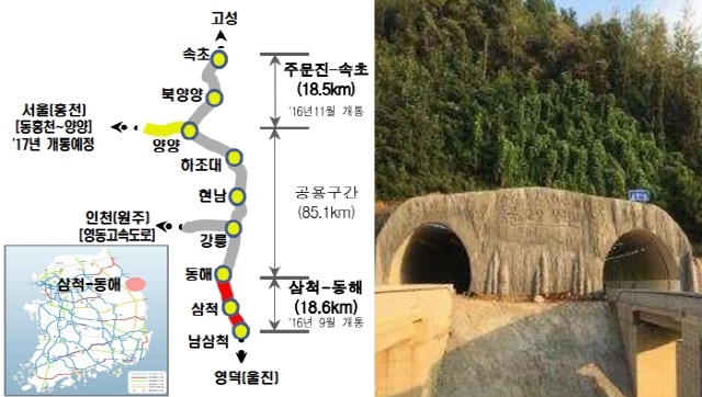삼척-동해간 고속도로는 2009년 착공된 지 8년 만에 개통하게 되었다. 통행거리는 20.7km에서 18.6km로 2.1km 단축되고, 통행시간은 32분에서 11분으로 21분 감축되었다. 이를 통해 국토부는 물류비용이 연간 327억원 절감될 것으로 예상했다.