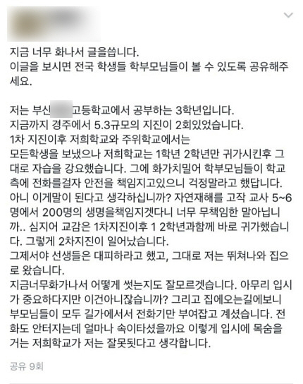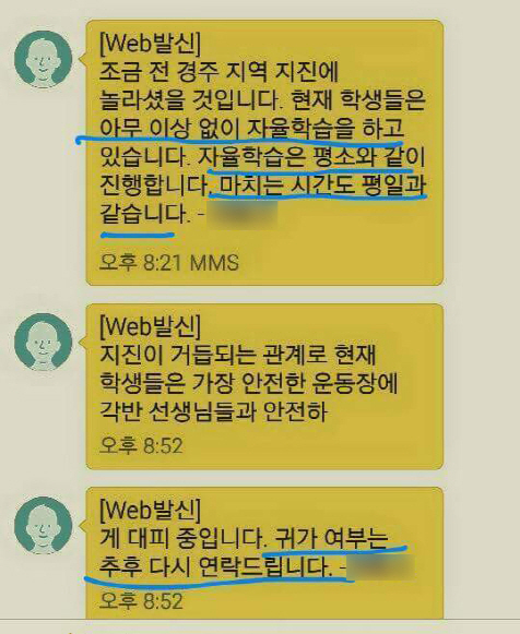 부산 모 고등학교에 재학중인 학생의 학부모가 공개한 문자에는 규모 5.1의 전진이 발생했는데도 불구하고 “학생들은 아무 이상 없이 자율학습을 하고 있으며 자율학습은 평소와 같이 진행한다는 내용이 담겨있었다.